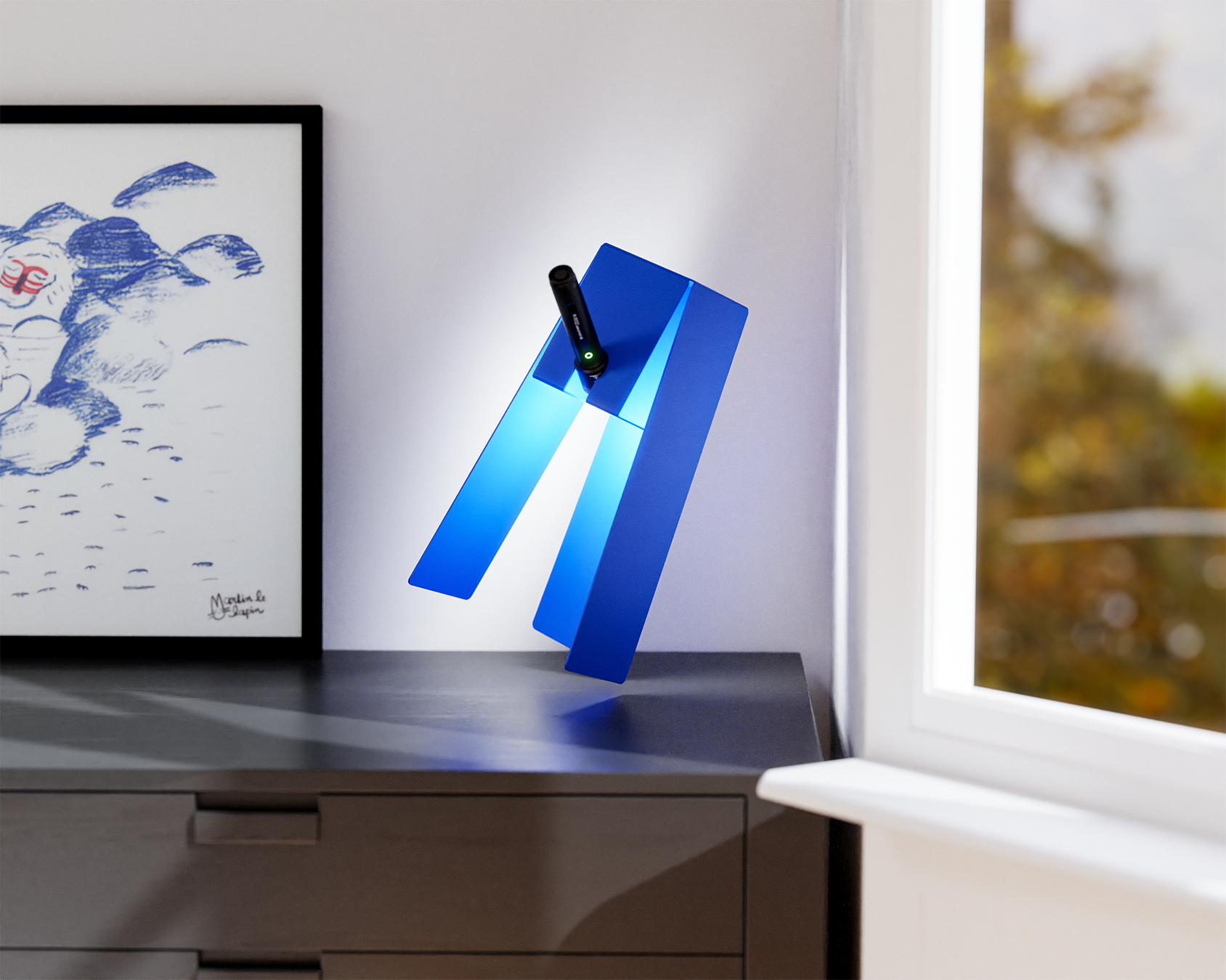 A 1000-lumen handheld torch sits inside a folded steel frame, transforming it into an architectural light object.