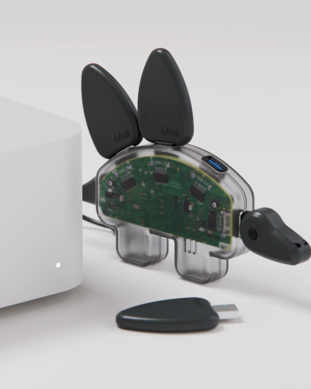 Multisaurus is a USB multi-port. Its playful design is inspired by the stegosaurus, featuring USB ports on its back that resemble the dinosaur's distinctive kite-shaped plates.