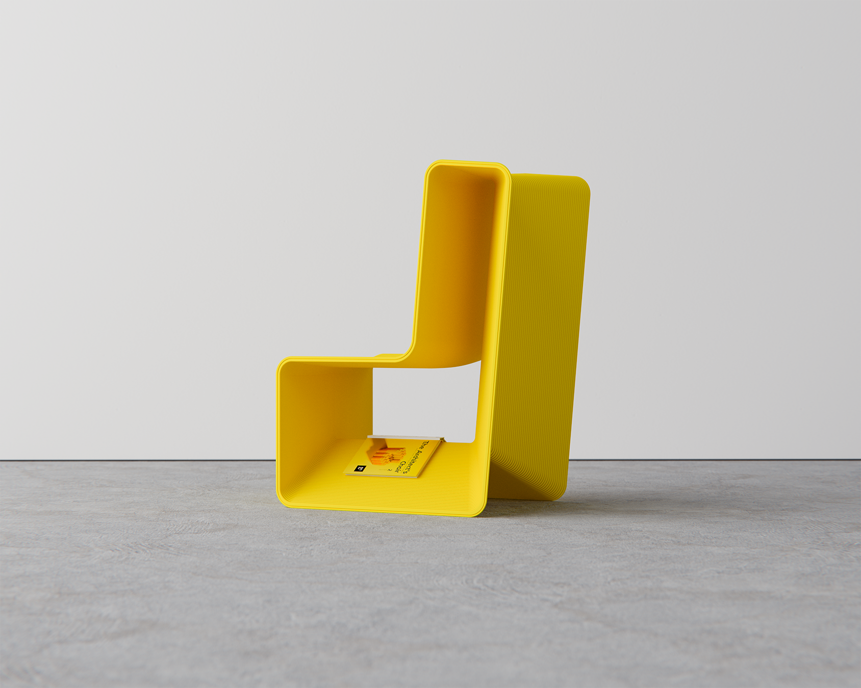 Verse is a 3D-printed chair featuring a curved seat that offers ergonomic support. Beneath it, a distinctive, sharp-angled structure doubles as a clever bookmark—holding your place in the story as you pause.